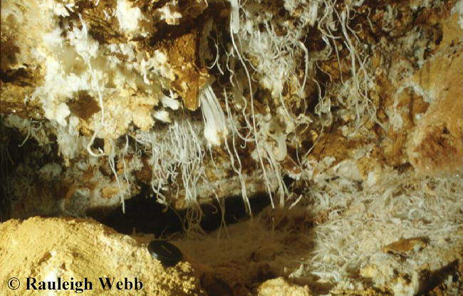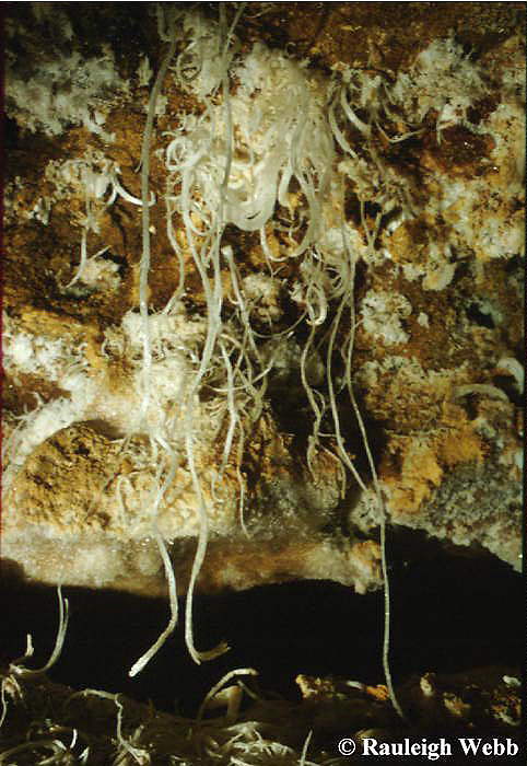 These curlicue extrusions (known as "flowers") are made up of a mineral more common to your kitchen than to caves. Arid caves of Australia's Nullarbor Plain have supported growth of these delicate fibers of halite, better known to surface-dwellers as table salt (NaCl, or sodium chloride). |