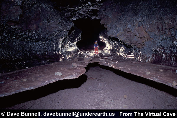 When lava ponds up in a passage it cools to form a smooth-surfaced lake. Typically the ponding occurs in plunge pool basins eroded beneath lavafalls, as seen in the lower photo. They may also occur when flows have been backed up by constrictions downstream of the flow due to passage collapse, which is probably what formed the now-drained lake in the top photo. |
