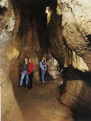 MYSTERYVarious artifacts found in the caverns indicate that the Indian Council Room was used by Wyandotte braves for making arrows and other stone implements until as late as 1810. Hundreds of these items were found when the caverns were opened and some are on display in the Museum. "Leatherlips," the chief of the Wyandottes, was killed at the entrance to the cavems by his own people. This remarkable geological wonder is now accessible to everyone from the picturesque Cave House atop the entrance. Concrete stairways descend 55 feet to the maze of natural passages and rooms oc cupying three different levels. The second level contains "Indian Lover's Bench," "Battleship Rock" and "The Crystal Room." "Fat Man's Misery" is a quaint passage leading to "Cathedral Hall" and "The Bell Tower" room 105 feet below the earth's surface. Beyond are passages and rooms still unexplored. A fourth level where an underground river is flowing to the Olentangy River, a half mile east, has been partially explored but not opened to the public. It is known that the river has formed a lake but its size has not been determined. Many miles of passages have never been explored and new mysteries including the location of the lost burial ground of the Wyandotte Indians are expected to unfold as these passages are opened. | ![]() |