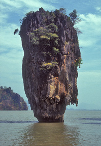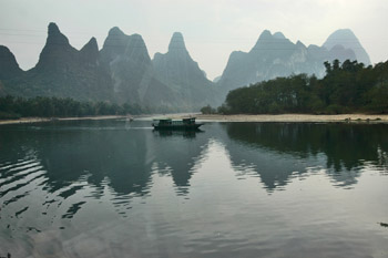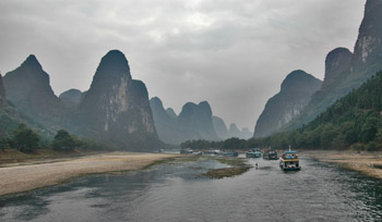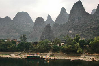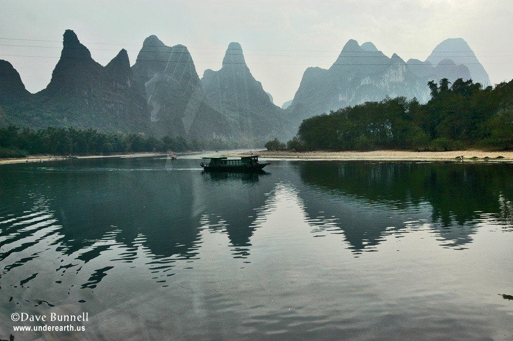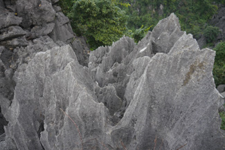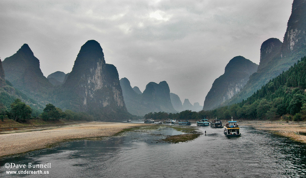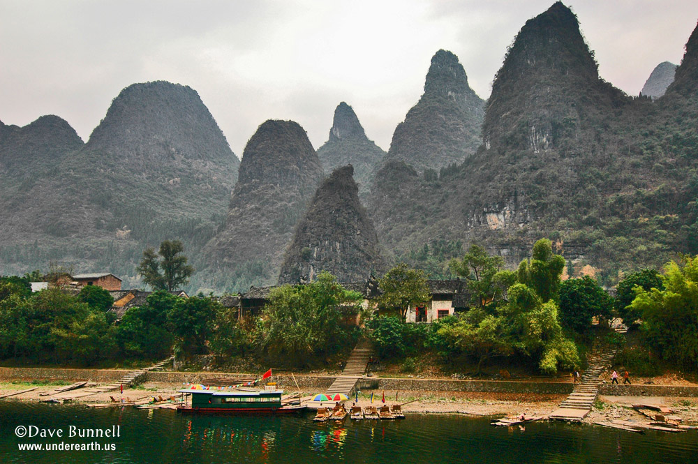 Perhaps the most famous and best developed of this form of karst is found in Guangxi Province, China. These images were taken from above or on the Li River, which cuts through the karst. In its flood plain are found more of the Fenglin, and further away are the larger mulit-peaked clusters of Fengcong karst. | ![]() |
