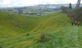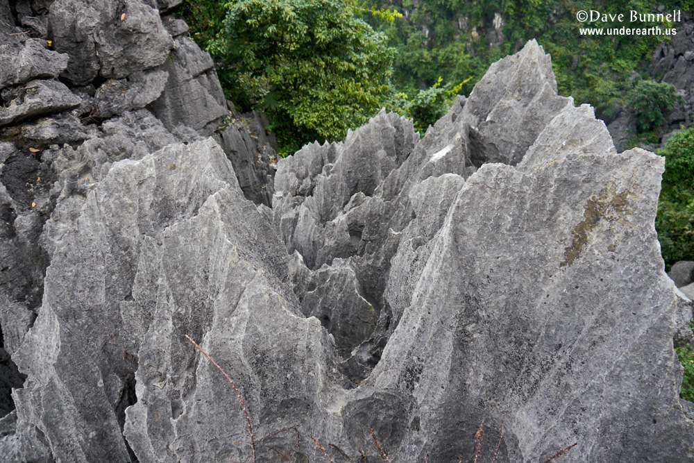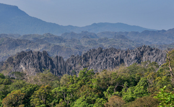 The Quintessential KarstWe begin with an image that absolutely screams "karst" because it is part of the actual landscape which gave rise to the name. Here, the river Reka flows through a large arch dividing two adjacent sinkholes. The river rises or resurges from a cave in the distant sink, its entrance just visible in the distance about the 4:00 direction from the church on the ridge. The river sinks again beyond. This scene is in the Škocjan Caves Regional Park in Slovenia. The region it is found has similar landforms throughout and is called Kras locally but karst in German. Now the term is used to refer to similar yet quite varied and beautiful landforms. At the top of the page is a karst ridge in central Laos near Vang Vieng. It also houses many caves. |