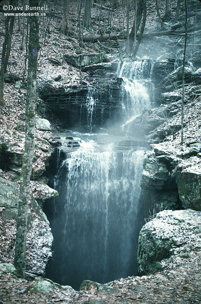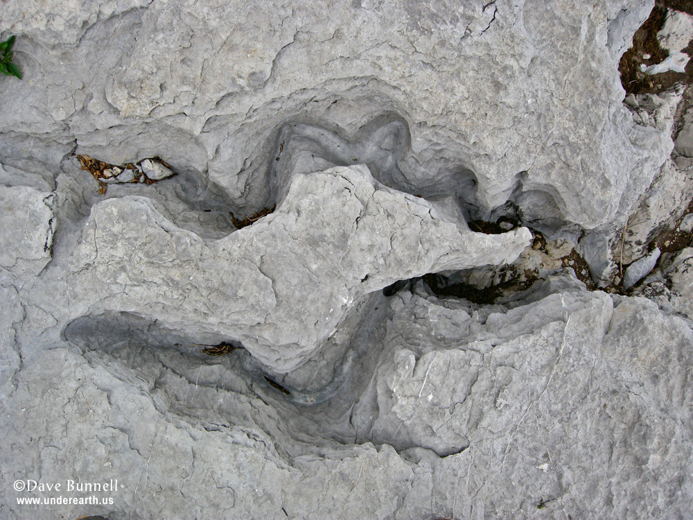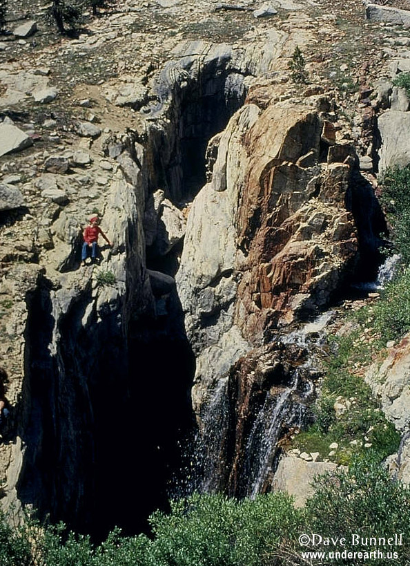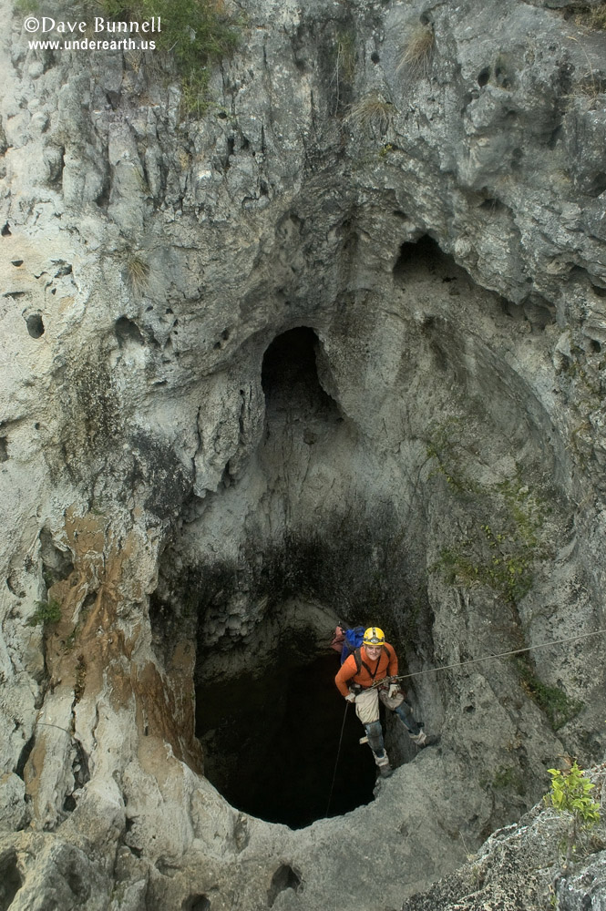 Pits and ShaftsA feature related to sinkholes is that of shafts and pits, otherwise known as "vertical" caves. In many cases these are basically sinkholes where collapse has led to steep sides. Often these may require rope to enter safely. The walls may be shear on all sides or have a debris slope as on the bottom left. Middle left, in a view from the bottom of a shaft, we can see the vertical grooves associated with erosion from surface water entering the pit. But the original enlargement probably occured below the water table. Top right, a pit in a heavily mantled (i.e. soil covered) karst. On the right are two examples of the extremes of the genre: A broad pit in Mexico, top, and a huge Tianxeng in China with a cave on the opposite wall. Often cave entrances in karst occur in the many fissures that form from solution. But there may be hundreds in a small area and most won't open into caves. |