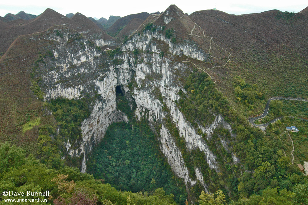 This massive pit is 613 meters deep, and 600 x 420 meters across. It is exceeded in size by only one other Tiankeng, also in China. |