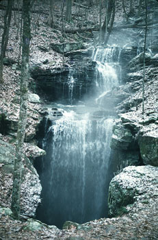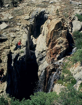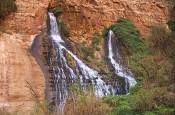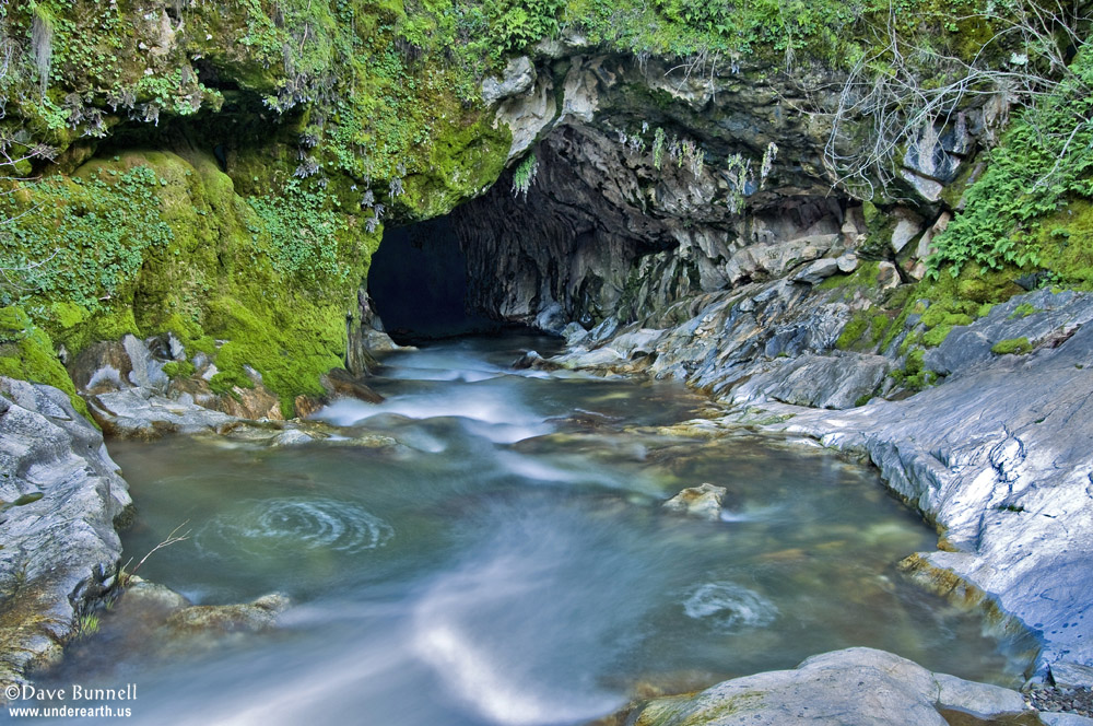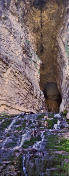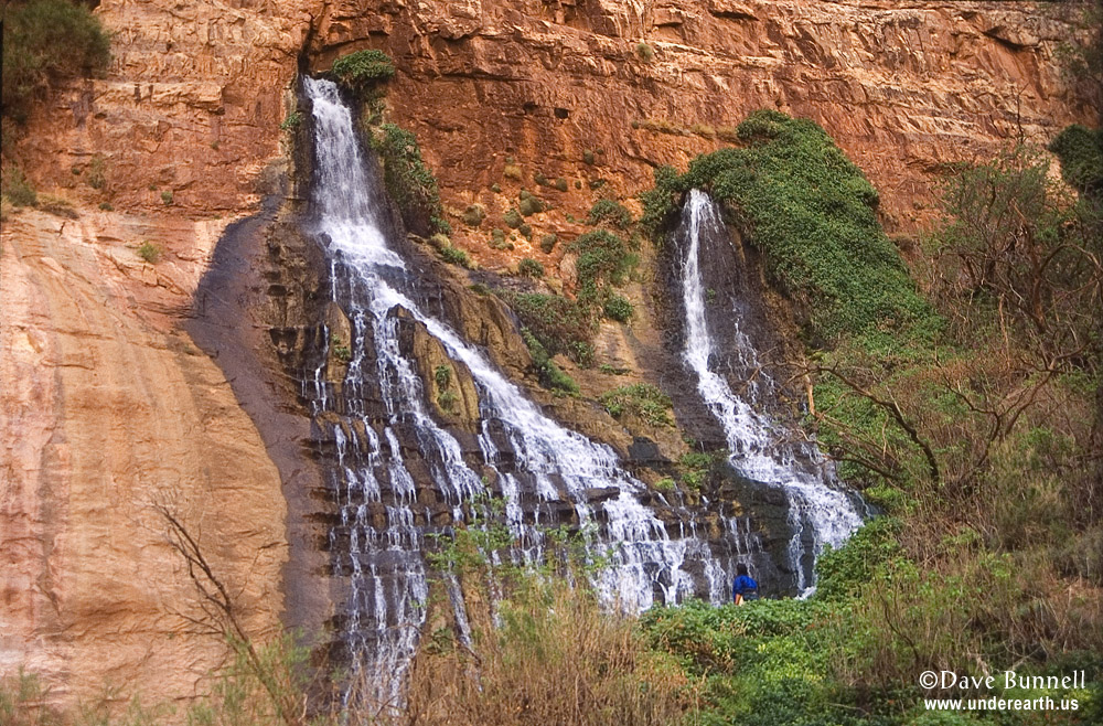 Springs and RegurgencesAll that water that sinks has to come out again somewhere. When it does we may call it simply a spring, which may form little more than a small pond. But a resurgence may also be a larger volume of water, even the birthplace of a river. Below is Vasey's Paradise, a major spring in the Grand Canyon emerging from the Redwall Limestone. |