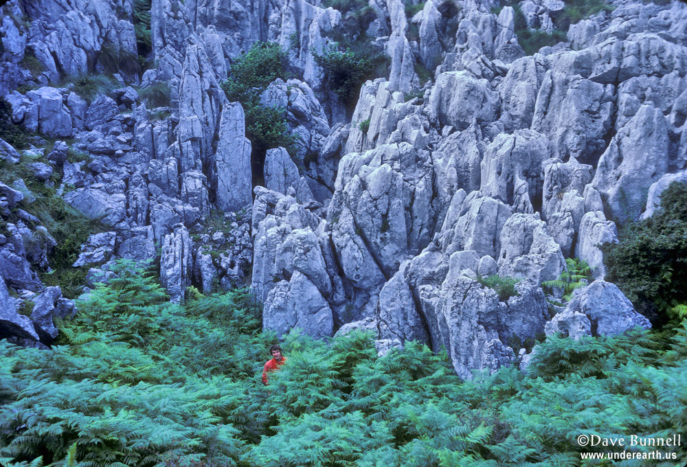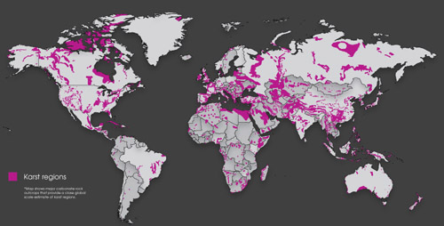 Karst is a term used to describe the distinctive surface landscapes of cave country, shaped by dissolution of soluble bedrocks such as limestone, dolomite, or gypsum. The surface character of karst results from both surface dissolution of exposed bedrock and dissolution beneath the surface as caves are formed. Voids forming beneath the surface result in slumping or collapse. Streams sink underground and may not reappear until miles away as springs or birthplaces of rivers. Karst landscapes encompass some 10-15% of the earth's land mass and millions of people live in or among karst. This page will attempt to convey both the diversity and beauty of the world's karst. |
