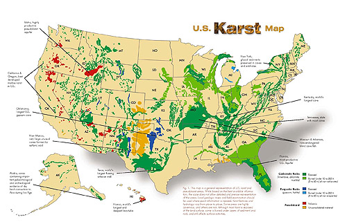 Distribution of Karst: USACarbonate rocks are found in almost every state, with the exception of Delaware and Rhode Island. Not surprisingly the states with the largest amount of karst contain the most caves, with Tennessee the clear winner with over 8000 caves followed by Missouri with 4000+. In the map on the right one sees lava flows marked as "pseudokarst," because these landforms may contain features associated with karst such as caves (lava tubes), collapses and pits. However, there are not due to solutional processes and hence the "pseudo" part of the name. In Florida the karst is young and caves are actively forming below the water table; the longest cave systems there are still completely submerged and being explored by cave divers. The U.S. National Park Service has created a nice poster map showing all the park units with caves and karst. |