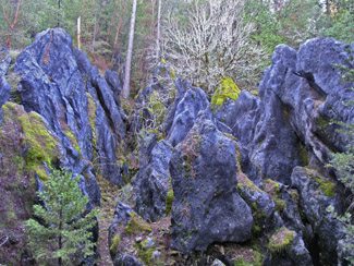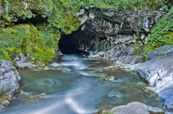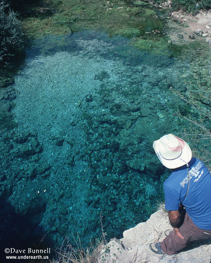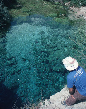 A karst spring in Spain shows the deep blue color afforded by dissolved limestones. |