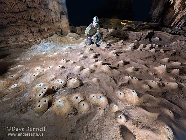Dried-up pool basins may be hosts to dozens of raft cones. Occasionally the cones dwarf even cavers, making these especially bizarre but beautiful cavescapes. Often ceiling drips remain active following the emergence of a raft cone from a dwindling pool. These continued drips crown many raft cones with unusual stalagmites, made not of massive calcite, but of needly, frost-like aragonite. The columnar projection atop the cone in the lsecond photo is a rather extraordinary example. If you could hover above this stal, you would likely find that it features a hollow drip canal along its central axis. It seems that drips penetrate raft cones, dissolve raft material, and are then wicked to the outer growing tips of stalagmites where they evaporate and deposit more aragonite. Raft cones are rather rare as cave formations go. The author knows of only two sites where they are found in the United States, a small cave in Nevada and in Lechuguilla Cave, in New Mexico, where they occur in spectacular size and number. Indeed, Lechuguilla was thought to have the most numerous and tallest raft cones known, as shown in the photos below. But in 2014 a team of British explorers found a large and spectacular group of such cones in a high chamber in Hang Va, a cave in Phong Nha-Ke Bang National Park in Vietnam,.. Unike Lechuguilla, this cave can be visited on paid adventure tours. I took the lower photo on one of these in 2016. In 2026 I visited a cave in Thailand with spectacular raft cones that look like miniature volcanoes. It is clear in the top photo that the drips that originally formed these raft cones continued after they were formed and drilled perfectly centered holes in each of them. |