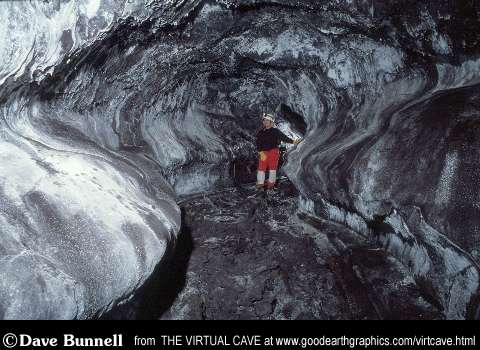 A surface that slopes down into the passage from a lava tube's wall is an apron. In contrast to cutbanks, aprons tend to occur on the inside edge of a meandering lava tube passage where the flow's velocity is lowest, and thermal erosion is reduced. This in turn allows more lava to accumulate. In the photo, there are aprons on both sides of the passage but the lefthand one is more pronounced. Often aprons go to the floor, but these ones are undercut, possibly by a later flow episode. |