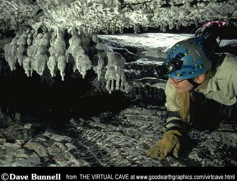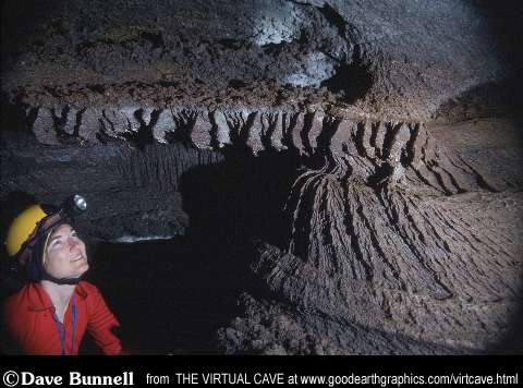 The thicker blades in the lower photo may have begun as thin blades that were then coated by upwelling lava, like sharktooth stalactites and splash stalactites. Blades are relatively uncommon outside of Hawaiian lava tubes, but a more common, and possibly related formation is the "castellations, " commonly seen on the edges of levees. Long shelves of small lava blades occur in some caves in New Mexico's El Malpais. |