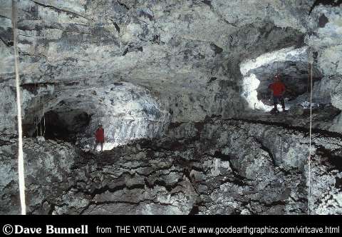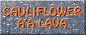 Very commonly, lava tubes are floored with a rough, bumpy, frothy surface that is transitional between a smooth, ropy pahoehoe lava (common on tube floors) and pure a`a lava (which is unusual on tube floors). It may include chunks of breakdown and broken pieces of stalactites. The cauliflower form is a solid floor, whereas floors with loose fragments of rough lava (as opposed to breakdown) are called clinker floors. |