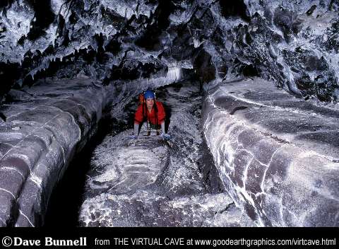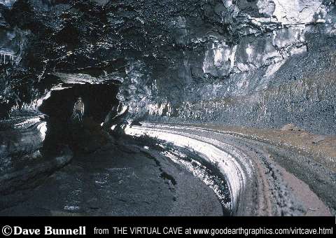 Ledges are often left along the edges of sinuous lava tube passages, and are usually somewhat rectangular in cross section, joining walls and floor. Curbs, benches, and shelves are another names commonly applied to these features, which mark the edges of late-stage flows. Ledges may also occur higher on walls and be undercut, leaving catwalk like suspended ledges. These features are more common near entrances since cooling is more rapid in those areas. |
