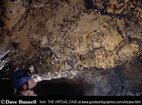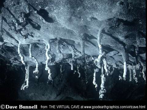 Helictites rarely have drip stalagmites lying underneath. Most likely, the crystallization at the ends of the tubes that redirect the flow also reduce it to the point that little material is ejected to fall on the floor beneath. The top photo shows a classic group of helictites with some calcite or gypsum crust on them. In the second photo, some unusually long (over a foot) helictites formed on the end of some tubular lava statlactites. In the bottom photo, one can see just how densely these formations may cover the ceiling of a tube. Needless to say, these formations are extremely delicate and caution must be taken when exploring near them. |