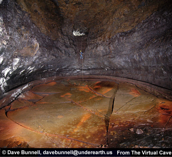 When lava ponds up in a passage it cools to form a smooth-surfaced lake. Typically the ponding occurs in plunge pool basins eroded beneath lavafalls, as seen in the lower photo. They may also occur when flows have been backed up by constrictions downstream of the flow due to passage collapse, which is probably what formed the now-drained lake in the top photo. |