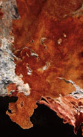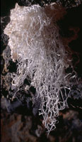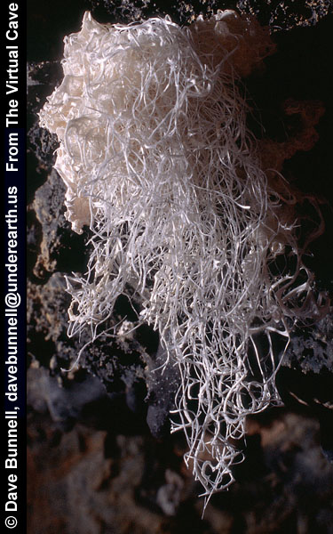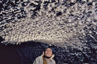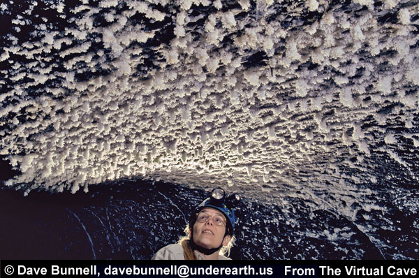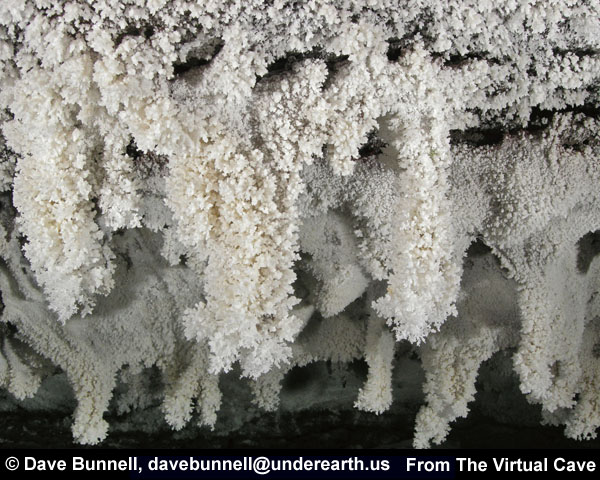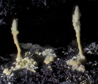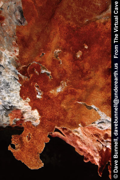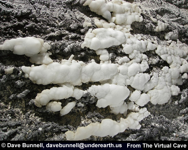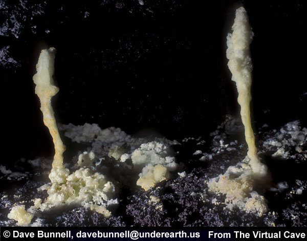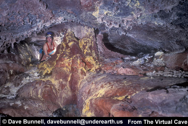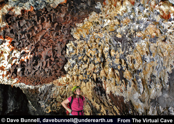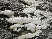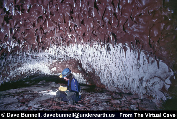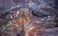 All of the lava tube features shown in the other sections of the Virtual Lava Tube are primary features, which formed from the molten lava while the cave was actively forming or in its cooling phase. But during or after a cave’s cooling phase, minerals may deposit as crusts, crystals, or as more familiar speleothems like stalactites and stalagmites. Deposits can occur in two major ways. As the cave initially cools, minerals can condense from gaseous vapors, typically forming crusts or small crystals. The deposits in the first two photos probably formed that way. After the cave has formed, water from rainfall begins to seep in through the porous lava. Initially this will dissolve away crusts formed from gaseous vapors, as we noted when visiting caves less than two years old on the flanks of Kilauea. But water passing through the rock may slowly leach out minerals that can be re-deposited inside the cave. The most common minerals in lava tubes tend to be sulfate minerals such as gypsum (calcium sulfate) and thenardite (sodium sulfate), but calcite (calcium carbonate) is common as well. Unlike in limestone caves, dissolved minerals are generally deposited from simple evaporation rather than off-gassing of carbon dioxide, the mechanism behind most dripstone deposits in solution caves. The third photo shows evaporitive deposits. |