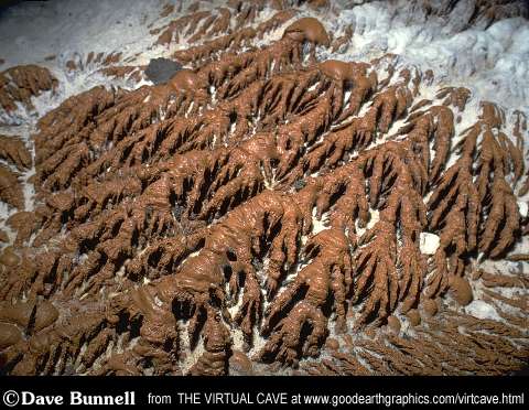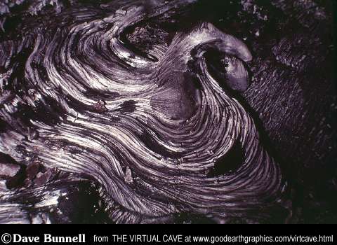 The first photo is a classic example of ropy pahoehoe on a lava tube floor with a bit of glaze. The lower photo shows an unusual variant found in some tubes that this author calls dendritic pahoehoe, but is also be a form of lava blade. It may result from lava flowing over Pele's hair. |