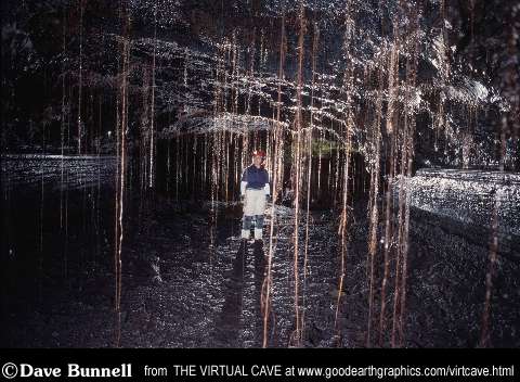 Lava tube passages tend to be fairly close to the surface, generally with less than 20 feet of overburden and sometimes less than a foot! Trees growing above the passage will often send down roots in search of water. In Hawaii, it is the ohia ohelu tree whose roots are most common, often forming a feathery jungle in the cave passage. When exploring the caves, care must be taken not to damage the roots. Not only is that not good for the trees, but the roots themselves are host to a complex and fragile community of cave-adapted insect life. Often these insects are endemic species found in only a few caves in an area. |
