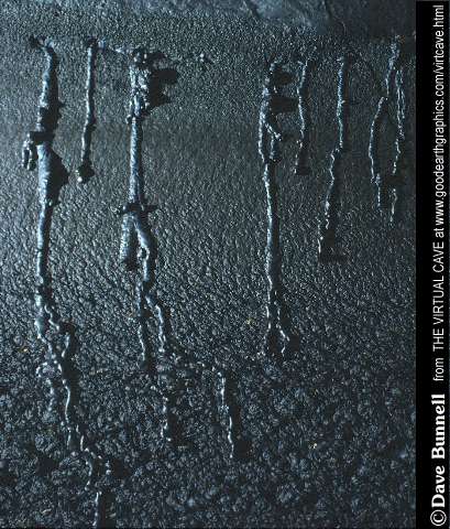 In appearance, runners look like driblets of lava running down the wall of the cave. They are actually a form of tubular lava stalactite formed along a surface instead of free-hanging. They may also form along the edge of a stalactite. Like tubular lava stalactites, they are formed of cooling segregated lava that is extruded from semi-crystalline wall matrices, propelled by boiling and escaping gases. |