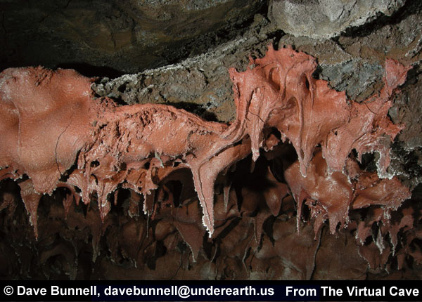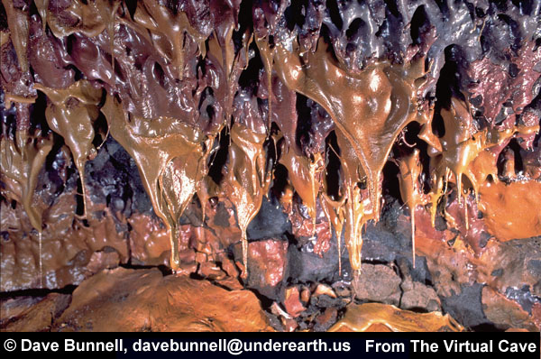 Frothing, turbulent lava flowing through a tube, or breakdown falling into molten lava, can splash stalactites on the ceiling, coating them with additional lava. The ends of such stalactites are likely to be irregular, as dripping lava hardens. In the first photo, a later flow of red lava has splashed the pre-existing stalactites. More commonly, splash stalactites can be a primary