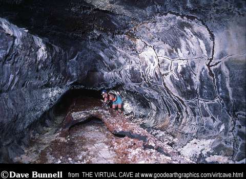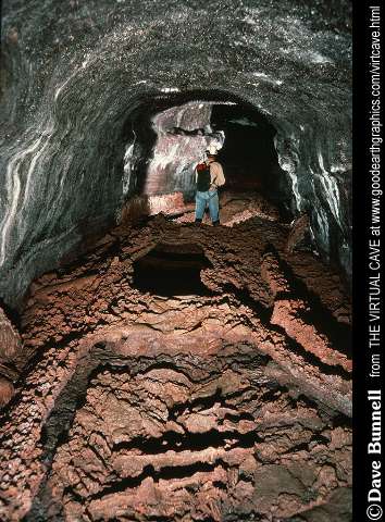 As a lava stream moves along the floor of an existing tube, it may form an insulating crust, just as occurs on the surface to form lava tubes. In fact, small tubes such as these are also common on surface pahoehoe lava flows. |