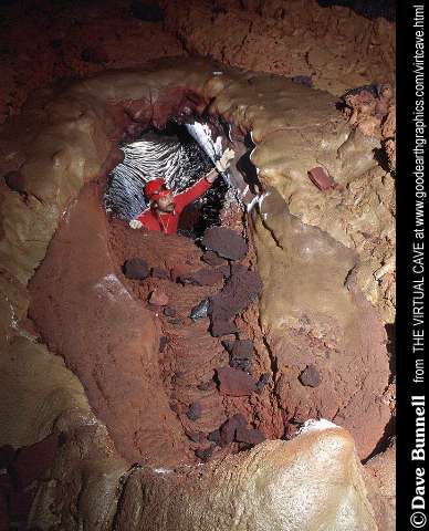 Lava tubes may form several levels, one formed below another. An opening between levels is a window. Lower levels, usually the last part of the tube to be active, may overflow into upper levels through windows, leaving a deposit along the edges. This upwelled lava may leave just a thin skin or lining around the window, or may seal it completely. |